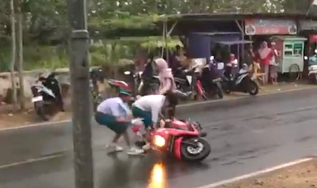 Reaksi cepat peserta gerak jalan tersebut patut diacungi jempol. Mereka langsung menolong pengendara tersebut dengan mendirikan motor secara cepat dan membawanya ke tepi jalan agar lebih aman.
