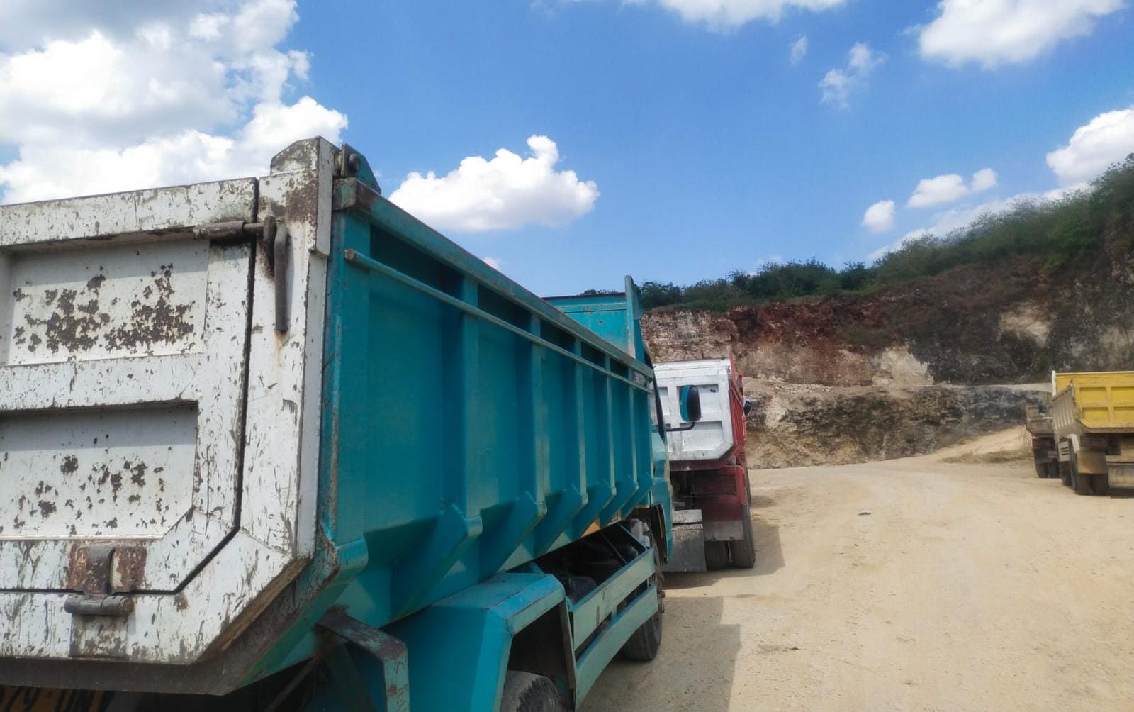 Truk pengangkut tanah hasil galian C di Desa Lomaer yang diduga ilegal sedang menunggu antrian, (Foto : Aris).