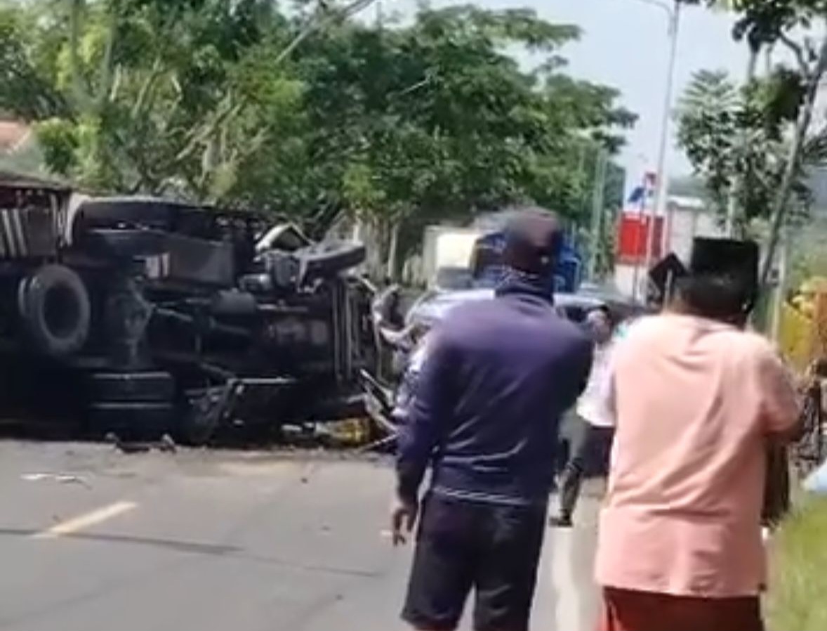 Bangkalan – Kecelakaan lalu lintas terjadi di Jalan Raya Desa Ko’ol, Kecamatan Klampis, Kabupaten Bangkalan, Selasa (25/11/2025) siang. Sebuah Toyota Innova menabrak truk boks bermuatan udang hingga membuat truk tersebut terguling dan memicu kemacetan di jalur Pantura.