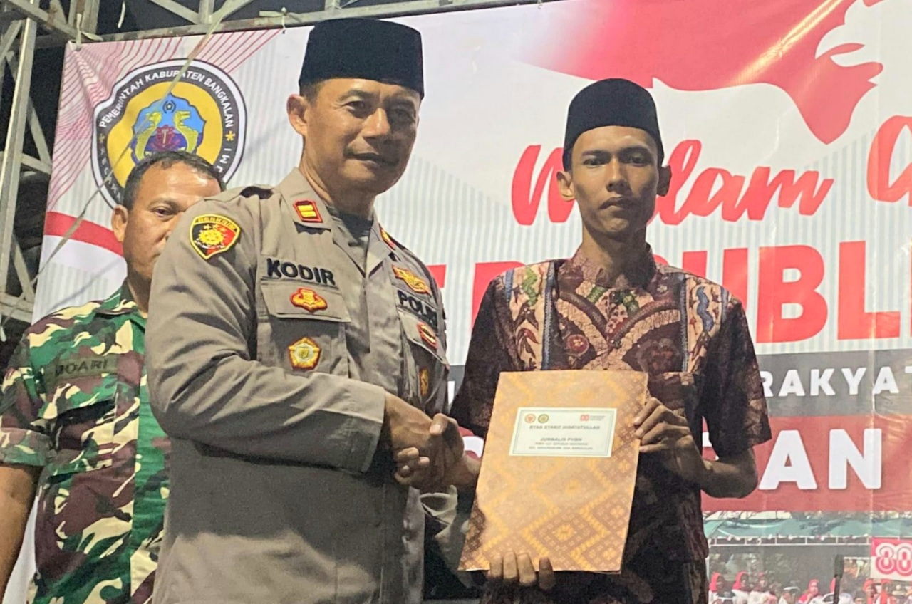 Ryan Syarif Hidayatullah saat menerima penghargaan sebagai jurnalis PHBN yang diberikan langsung oleh Kapolsek Tanjungbumi, IPTU Abdul Kodir, (Foto : Jatiminfo.id, 2025).