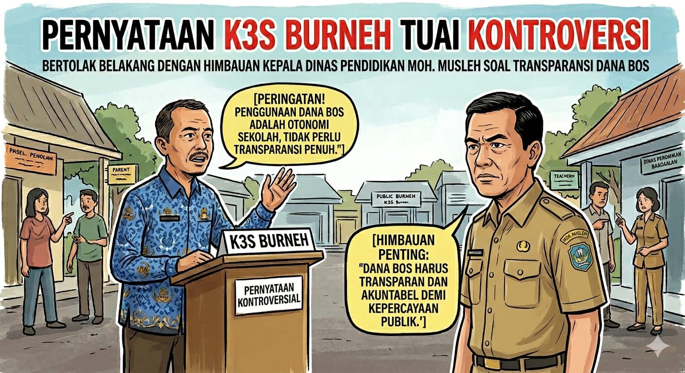 Bangkalan – Pernyataan Suraji, Kepala SDN Jambu 2 yang juga menjabat sebagai Kelompok Kerja Kepala Sekolah (K3S) Kecamatan Burneh, memantik kontroversi. Ucapannya dinilai bertolak belakang dengan imbauan resmi Kepala Dinas Pendidikan (Kadisdik) Bangkalan terkait pentingnya transparansi pengelolaan Dana Bantuan Operasional Sekolah (BOS).