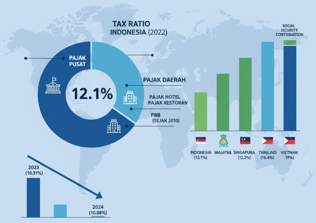 Staf Ahli Menteri Keuangan Bidang Kepatuhan Pajak, Yon Arsal, menjelaskan bahwa selama ini angka tax ratio Indonesia cenderung terlihat rendah karena belum memasukkan kontribusi pajak dari daerah-daerah. Padahal, menurutnya, sejumlah komponen Pajak Pertambahan Nilai (PPN), seperti pajak hotel dan restoran, kini telah menjadi bagian dari objek pajak daerah. Selain itu, Pajak Bumi dan Bangunan (PBB) juga sudah tidak lagi dikelola oleh pemerintah pusat sejak tahun 2010.