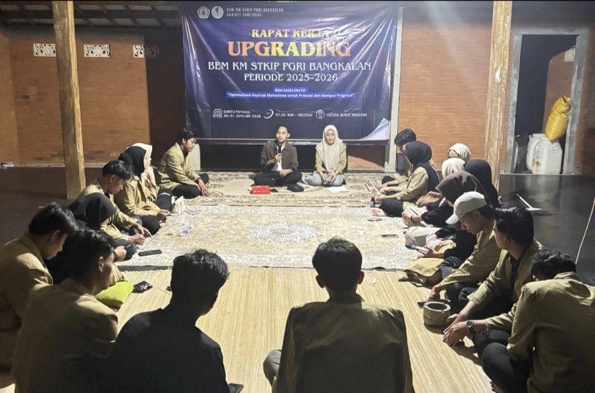 Bangkalan – Upaya menguatkan kapasitas internal kepemimpinan yang baru, Badan Eksekutif Mahasiswa Keluarga Mahasiswa (BEM KM) STKIP PGRI Bangkalan menggelar Rapat Kerja dan Upgrading selama tiga hari, di Bukit Hidayah Geger, Kabupaten Bangkalan, Jumat 30 Januari hingga Minggu 01 Februari 2026.