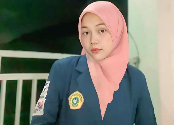 Indi Helmia, mahasiswi PGSD UTM berasal dari Desa Pelanggiran, Tanjungbumi, Bangkalan, tampil menggunakan almamater kebanggaan yang telah mengharumkan nama daerah dan kampusnya. (Foto: Jatiminfo.id, 2025).