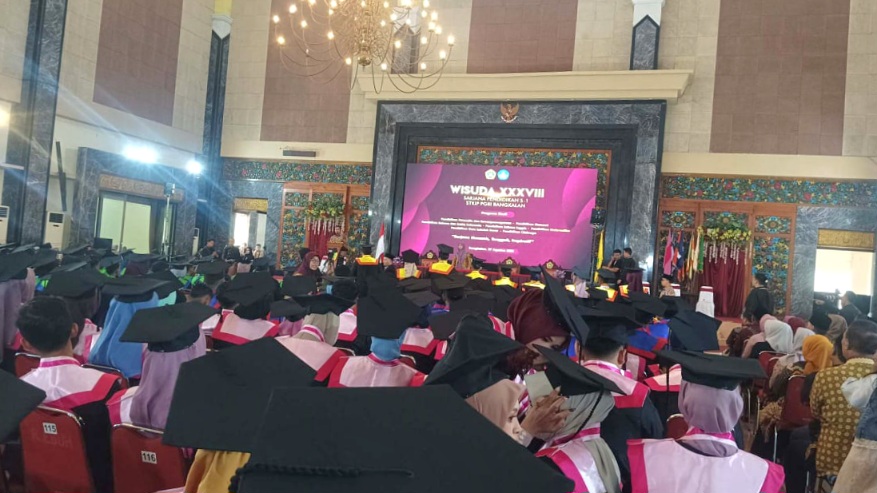 Pelaksanaan wisuda berlangsung meriah dan antusias para peserta wisuda yang terpusat di Gedung Serbaguna Rato Ebhu Bangkalan, (Foto : Jatiminfo.id, 2025).